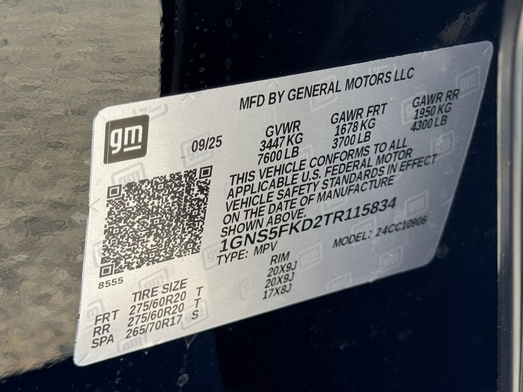 THIS VEHICLE ALSO INCLUDES THE FOLLOWING OPTIONS AND FEATURES: Preferred Equipment Group 1LZ (20 x 9 Polished Aluminum Wheels, 3rd Row 60/40 Power-Folding Split-Bench, 4-Way Power Driver Lumbar Seat Adjuster, 4-Way Power Front Passenger Lumbar Seat Adjuster, 8-Way Power Front Passenger Seat Adjuster, Auto-Dimming Inside Rear-View Mirror, Chrome Mirror Caps, Dual Exhaust System, Front LED Fog Lamps, Heated 2nd Row Outboard Seats, Heated Power-Adjustable Outside Mirrors, Heated Steering Wheel, Interior Camera, LED Tail Lamps, Magnetic Ride Control Suspension, Memory Settings, Power Release 2nd Row Bucket Seats, Power-Sliding Center Floor Console, Rear Power Liftgate, Universal Home Remote, and Wireless Phone Charging), 10 Speakers, 3.23 Rear Axle Ratio, 3rd row seats: split-bench, 4-Wheel Disc Brakes, 8-Way Power Driver Seat Adjuster, ABS brakes, Adaptive suspension, Air Conditioning, Alloy wheels, AM/FM radio: SiriusXM with 360L, Apple CarPlay/Android Auto, Auto High-beam Headlights, Auto-dimming door mirrors, Auto-dimming Rear-View mirror, Auto-leveling suspension, Automatic temperature control, Brake assist, Bumpers: body-color, Compass, Delay-off headlights, Driver door bin, Driver vanity mirror, Dual front impact airbags, Dual front side impact airbags, Electronic Stability Control, Emergency communication system: OnStar Services capable, Exterior Parking Camera Rear, Four wheel independent suspension, Front anti-roll bar, Front Bucket Seats, Front Center Armrest, Front dual zone A/C, Front fog lights, Front reading lights, Fully automatic headlights, Garage door transmitter, Heated door mirrors, Heated front seats, Heated rear seats, Heated steering wheel, Illuminated entry, Low tire pressure warning, Memory seat, Navigation system: Google built-in compatibility (select service plan required, terms and limitations apply), Occupant sensing airbag, Outside temperature display, Overhead airbag, Overhead console, Panic alarm, Passenger door bin, Passenger vanity mirror, Perforated Leather Seating Surfaces, Power door mirrors, Power driver seat, Power Liftgate, Power passenger seat, Power steering, Power windows, Radio data system, Radio: 17.7 Diagonal Advanced Color LCD Display, Rain sensing wipers, Rear air conditioning, Rear anti-roll bar, Rear reading lights, Rear window defroster, Rear window wiper, Remote keyless entry, Security system, Speed control, Speed-sensing steering, Split folding rear seat, Spoiler, Steering wheel memory, Steering wheel mounted audio controls, Tachometer, Telescoping steering wheel, Tilt steering wheel, Traction control, Trip computer, Turn signal indicator mirrors, Variably intermittent wipers, Ventilated front seats, Voltmeter, and Wireless Apple CarPlay/Wireless Android Auto.