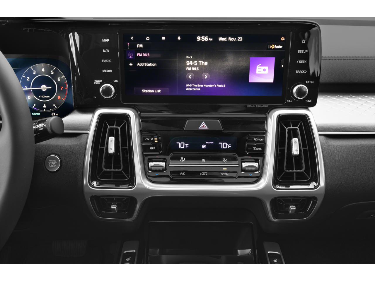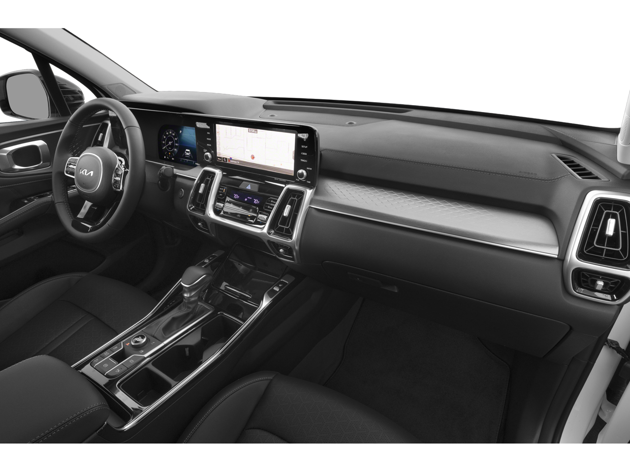 The Sorento SX's striking exterior is complemented by a meticulously crafted interior that showcases Kia's commitment to premium materials and attention to detail. Sink into the heated, 8-way power-adjustable front seats and enjoy the convenience of the Smart Key with push-button start and remote start. The expansive panoramic sunroof and advanced infotainment system with navigation further elevate the driving experience.